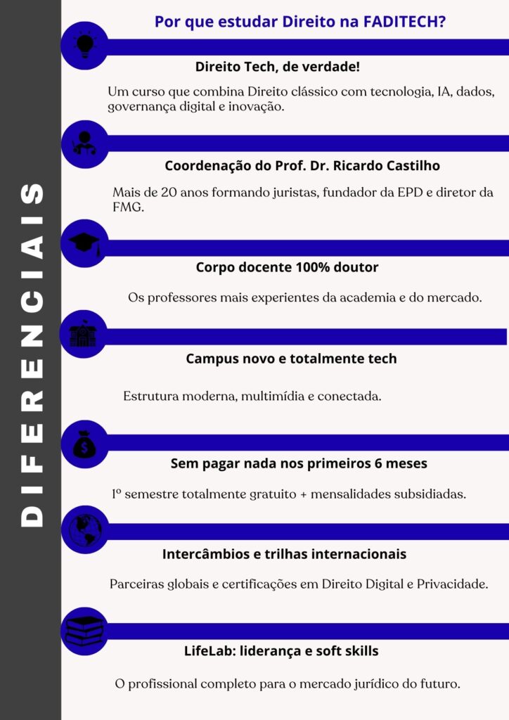 Na Faditech, você encontra muito mais do que um curso de Direito: encontra uma formação completa, atual e conectada às transformações do mundo jurídico. Aqui, teoria sólida, prática real desde o primeiro semestre e tecnologia avançada caminham juntas para preparar você para os desafios e oportunidades da nova advocacia.